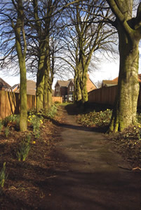 The ground-cover of ivy is splashed with daffodils and crocuses.